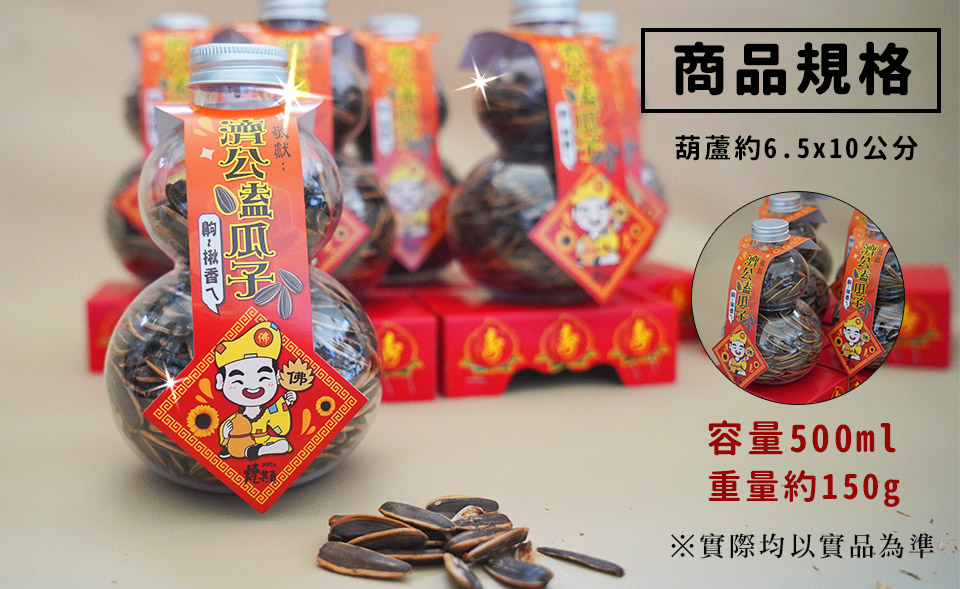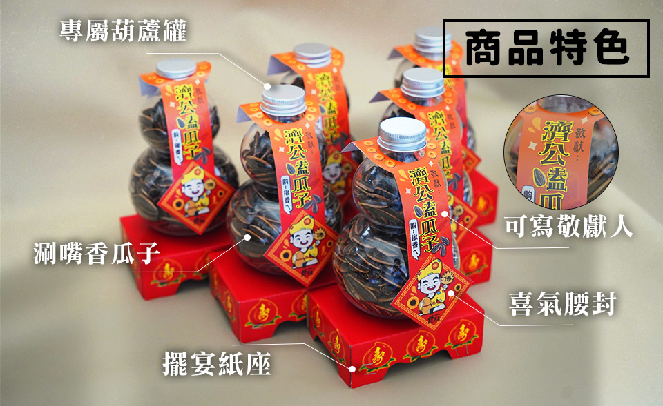 商品特色 √濟公專屬、√涮嘴瓜子、√方便祝壽、√宴王吸睛 內容物 瓜子葫蘆瓶6、專屬字條6、紙座*6 注意事項 ※ 台灣製造、快速出貨※ 產品有效日期約12個月(實際已包裝日期為主)※ 商品尺寸約10*6.5cm※ 容量500ml、重量約 150公克/一罐※ 實際均以實品為準 Q&A 請問敬獻腰封可以改嗎?無法更改,敬獻可自行書寫。 請問瓜子有效日期?12個月 (實際已商品日期為主) 大概製作時間多長?製程大約2-3日(不含假日) 請問能貨到付款嗎?有。目前只開放超商貨到付款(全家、7-11)※祝壽旺季建議匯款到府,才不會耽誤祝壽時辰 如果量大有另外優惠嗎?可以私訊官方LINE洽詢。 請問可以買一罐就好嗎?固定6罐組合出貨,不另外販售單罐。 聯絡我們Facebook Line Instagram
